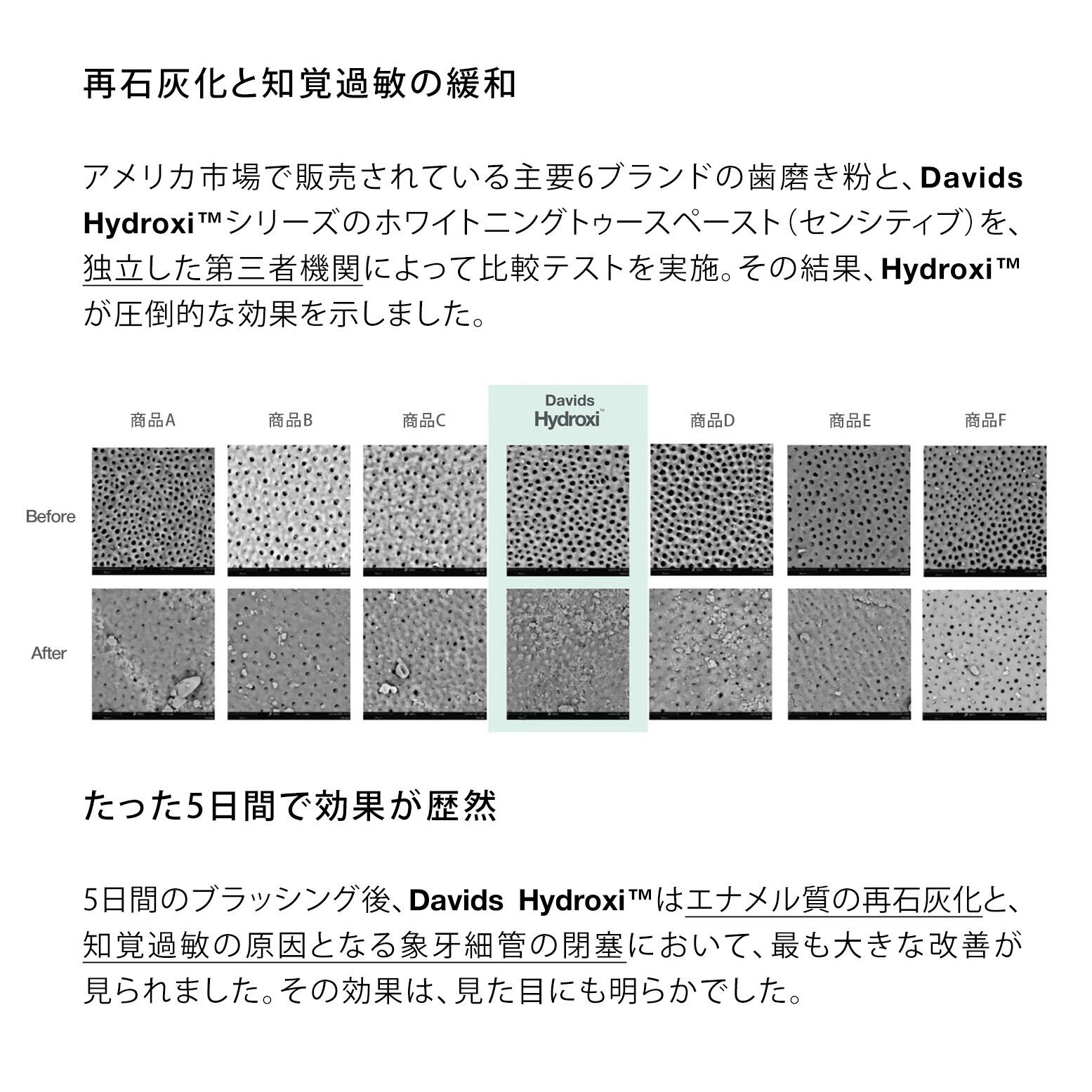 【歯のエナメルトリートメントができる、ナノヒドロキシアパタイト配合 Hydroxi™シリーズ】Hydroxi™は、Davidsが独自に開発した成分ブレンドです。歯の再石灰化を助ける「ナノヒドロキシアパタイト」を中心に、厳選された天然由来成分を組み合わせてつくられています。歯のエナメル質をやさしくケアしながら、自然な白さへと導いてくれるのが特長です。